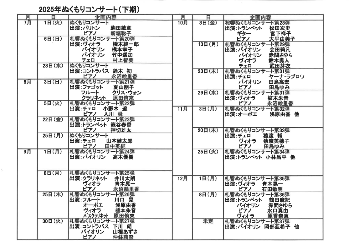 2025年7月~12月 ぬくもりコンサートのお知らせ