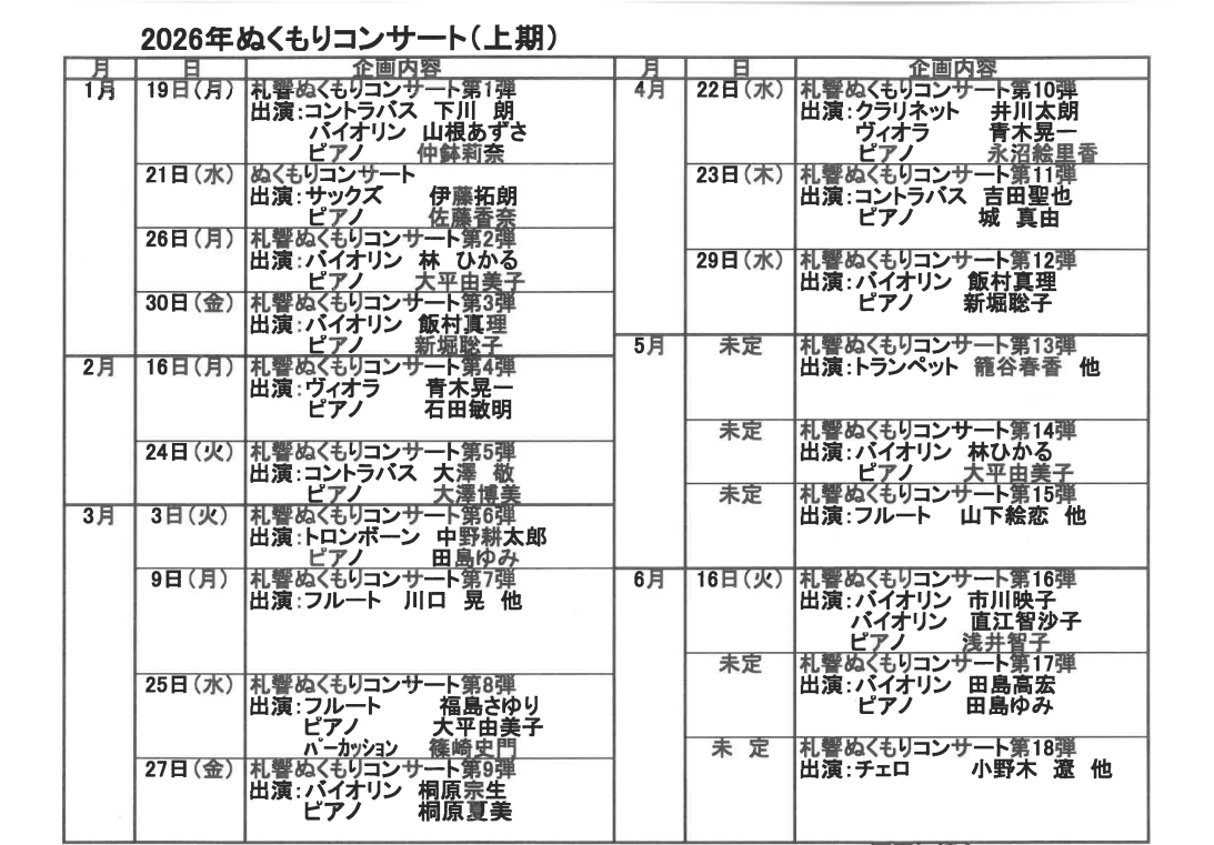 2026年1月~6月 ぬくもりコンサートのお知らせ